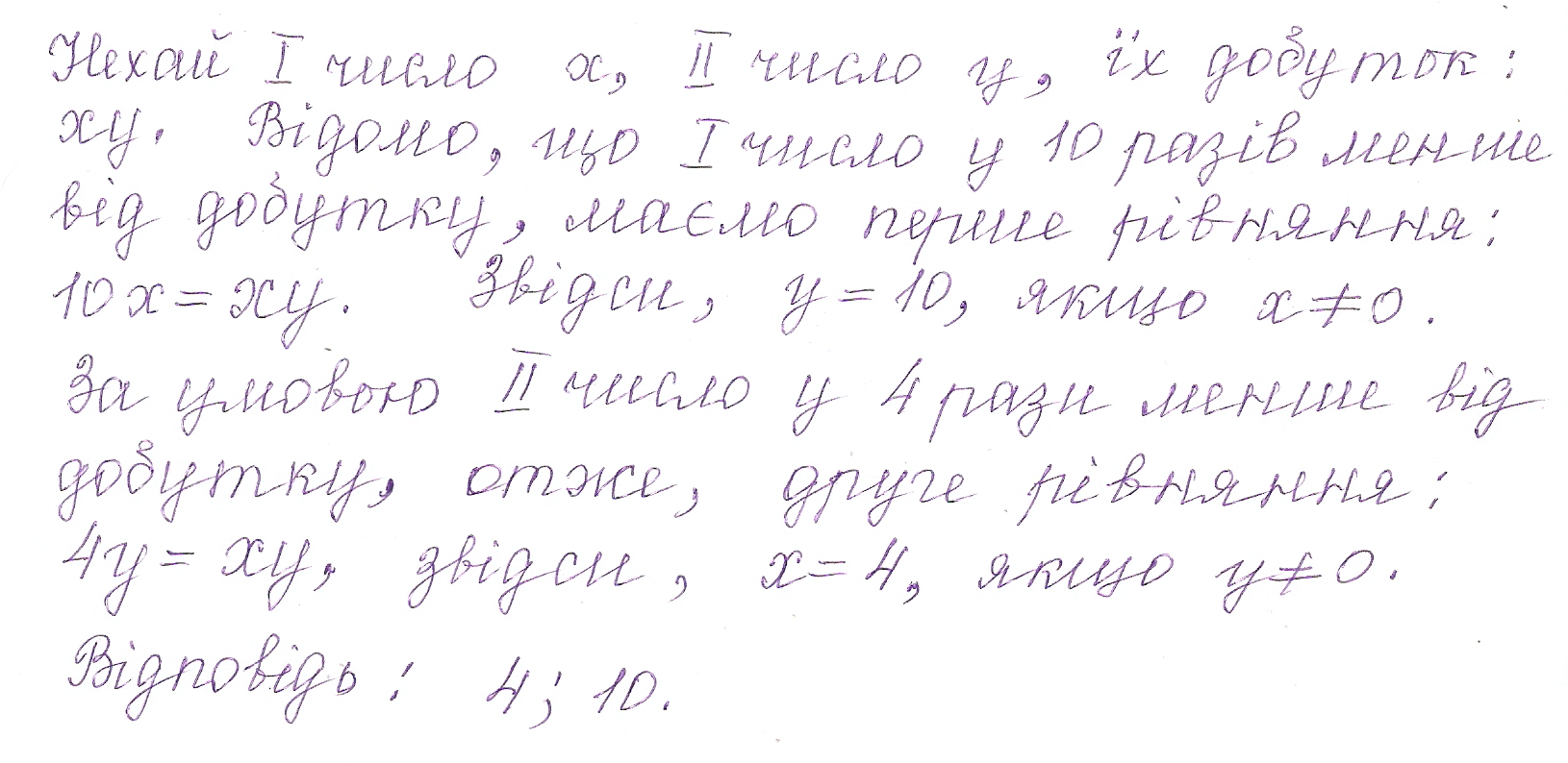 ЦИТАТА: “знайди 2 числа, одне з яких у 10 разів менше від їх добутку, а друге менше від їх добутку в 4 рази”