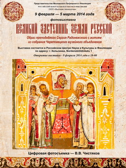 С 9 февраля по 5 марта 2014 года в Российском центре науки и культуры в Хельсинки (Финляндия) пройдет выставка «Великий заступник земли Русской». Фотовыставка познакомит зрителей с замечательным художественным произведением XVII века — иконой «Преподобный Сергий Радонежский с житием» из собрания Череповецкого музейного объединения. Около 30 фотографий, выполненных В.В. Чистяковым в 2013 году, представят общий вид иконы, средник и 24 житийных клейма.