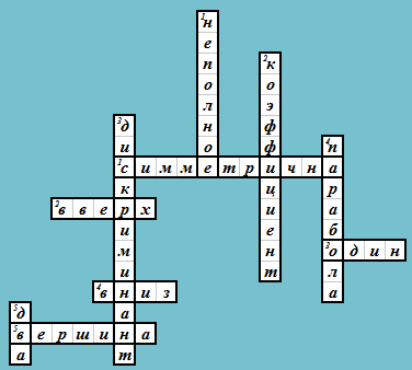 Ответ на кроссворд №4 (КВАДРАТНЫЕ УРАВНЕНИЯ И КВАДРАТИЧНАЯ ФУНКЦИЯ) АвторLyudmula Abramochkina / Опубликовано14.03.201314.03.2013Оставить комментарий КВАДРАТНЫЕ УРАВНЕНИЯ И КВАДРАТИЧНАЯ ФУНКЦИЯ Слова кроссворда: По горизонтали: 1. симметрична 2. вверх 3. один 4. вниз 5. вершина По вертикали: 1. неполное 2. коэффициент 3. дискриминант 4. парабола 5. два