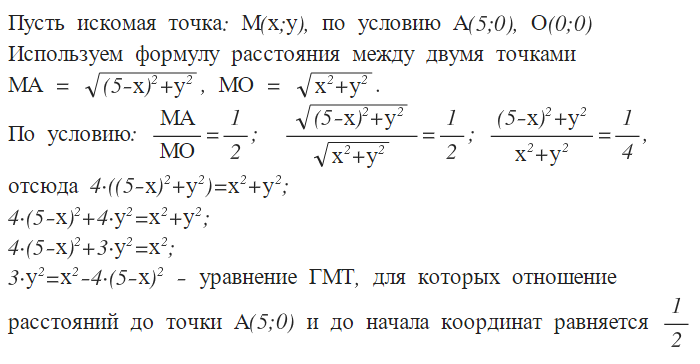 Задача про ГМТ. Высшая математика АвторLyudmula Abramochkina / Опубликовано09.12.201709.12.2017Оставить комментарий Составить уравнение ГМТ (геометрическое место точек), для которых отношение расстояний до точки А (5;0) и до начала координат равняется 1/2 Решение: